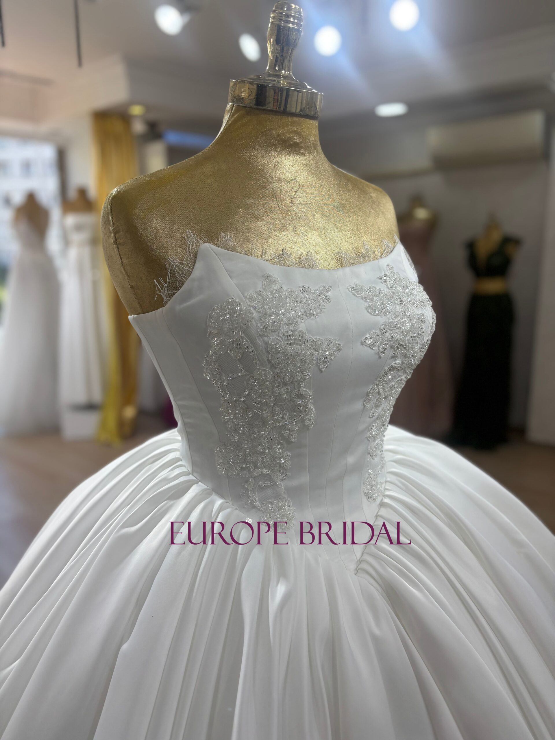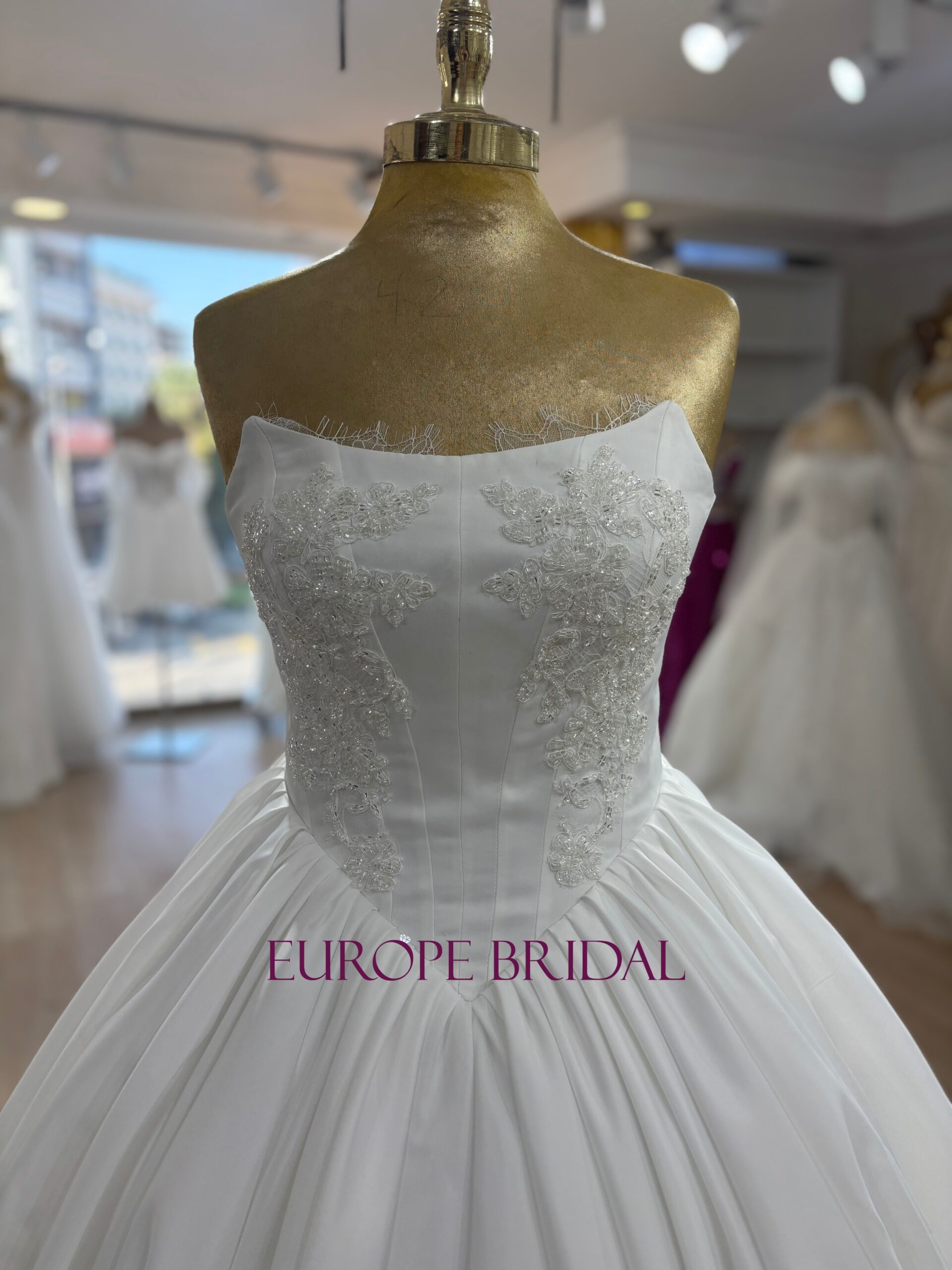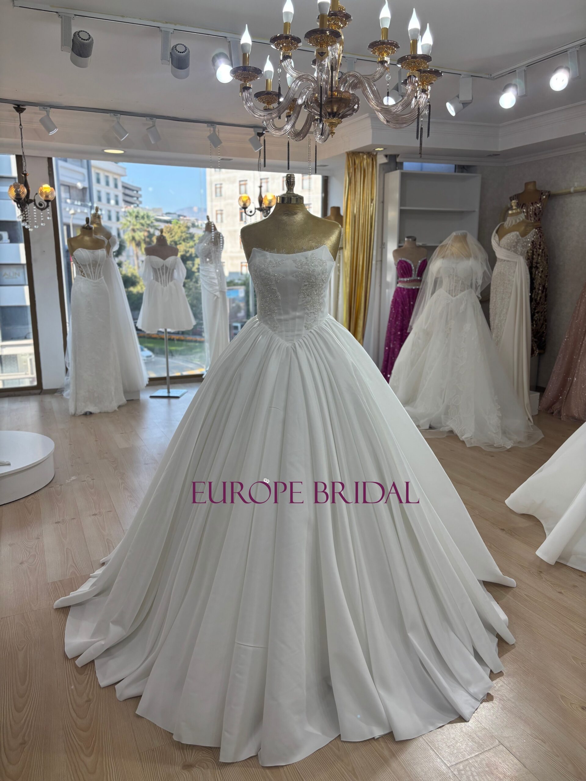 Model 26103 is a masterpiece of modern architectural design, crafted from high-quality rich satin to create a structured and majestic silhouette. The gown features a trendy strapless corset with a distinct basque waistline that elongates the torso and highlights the bride’s figure with precision. The voluminous skirt creates a grand ball gown effect, featuring deep pleats that provide elegant movement and a clean, sophisticated finish suitable for grand venues.