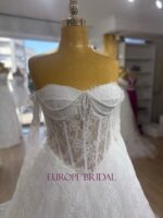 Model 26104 is a romantic vision of all-over lace, designed for the bride who cherishes vintage charm blended with modern versatility. The foundation of the gown is a stunning strapless corset bodice featuring visible boning and a sweetheart neckline, elegantly draped with strands of pearls across the bust for a touch of opulence. This A-line silhouette flows into a skirt rich with floral lace textures, creating a soft and dreamy aesthetic that flatters every figure.