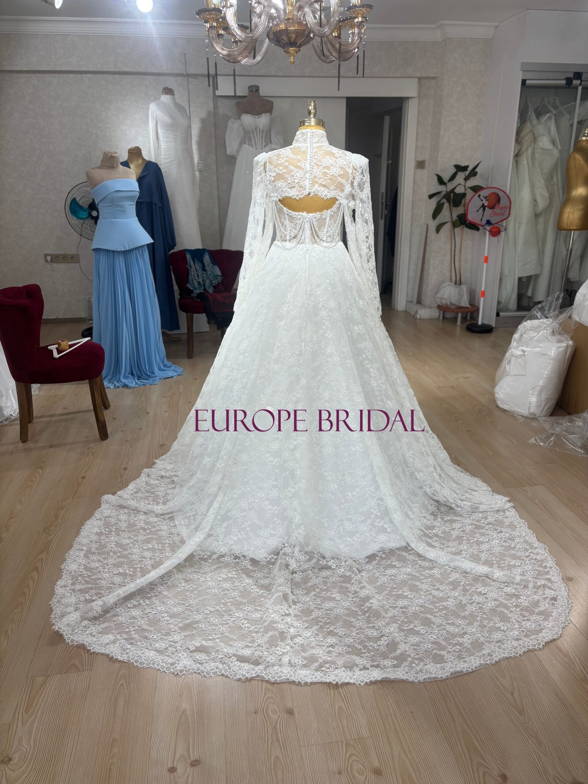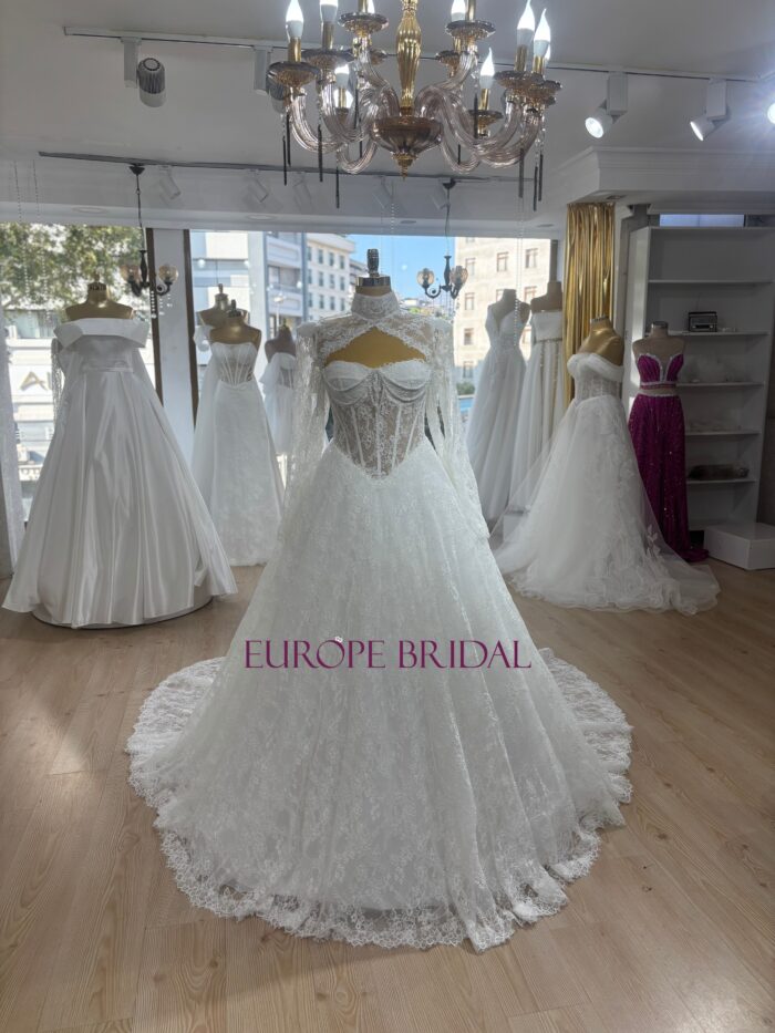 As a skilled bridal manufacturer, we have crafted this design to offer two distinct looks in one. The gown can be transformed with a removable high-neck lace bolero that features long sleeves and a sophisticated keyhole back, offering modest coverage for the ceremony. When worn without the overlay, the back reveals exquisite hand made pearl swags that drape gracefully across the skin, adding a unique jewelry-like effect to the design.