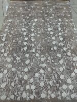 This off-white lace features captivating 3D floral clusters interwoven with delicate leaf accents. Each blossom is lightly layered, creating a soft, dimensional effect, while tiny beads and sequins add just the right amount of sparkle. Whether you place it on a bustier or let it flow down a skirt, this lace effortlessly brings a romantic, garden-inspired charm to any gown.